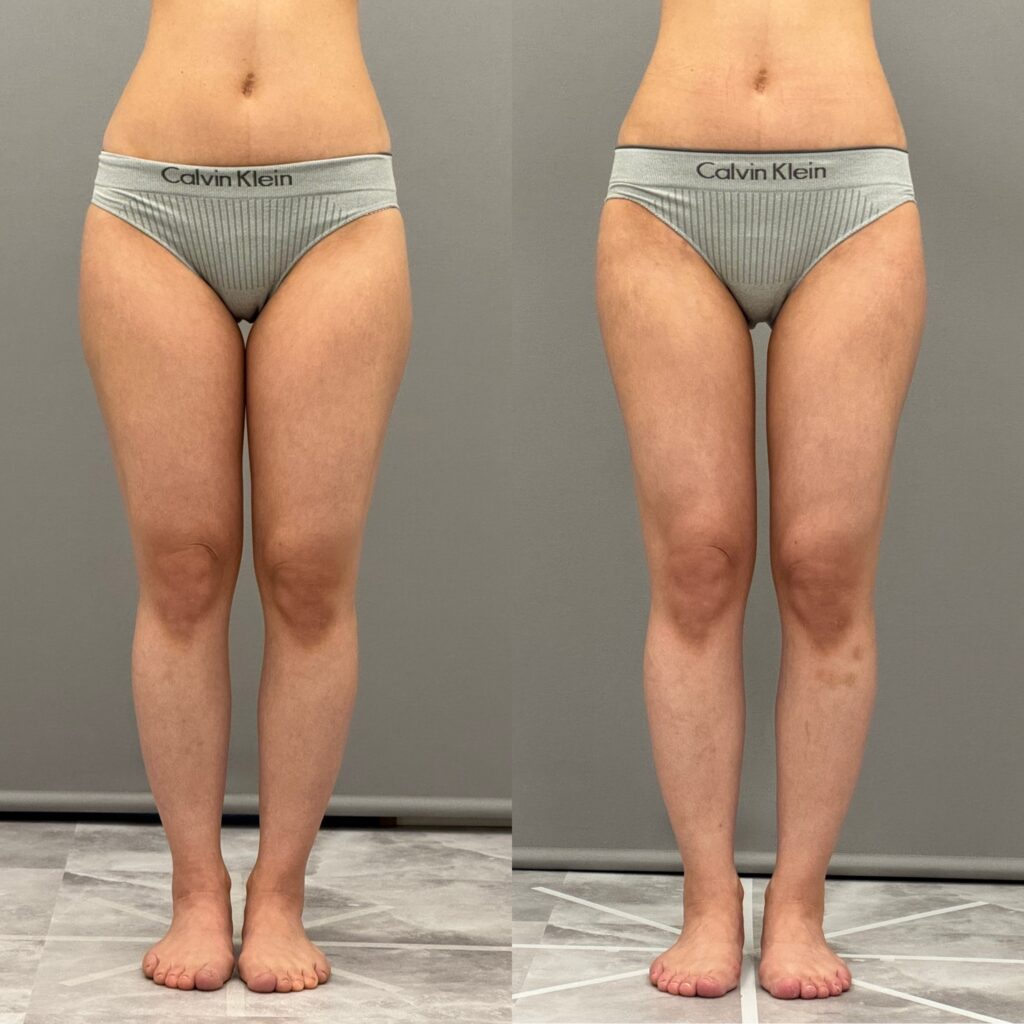 太もも全周を吸引した症例です。内ももやお尻の張り出しが気になる方は多いと思います。3ヶ月経過してスッキリして細くなりましたね。内ももに隙間もできました。まだ6ヶ月まで引き締まってさらに細くなります。当院ではパーツごとでも可能ですが、全周で吸引していただいた方が仕上がりがきれいなのでお得なセット価格もご用意しています。気になる1部位からでもOKです。