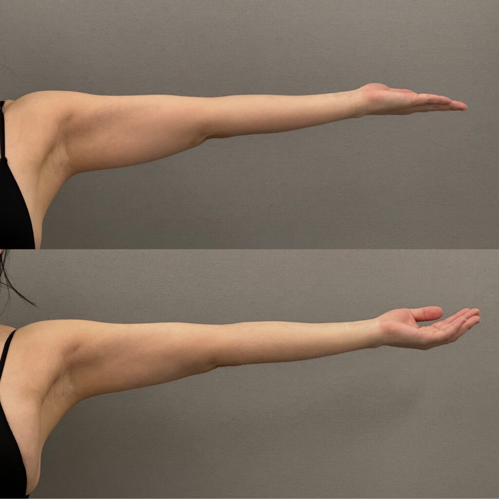 30代女性 二の腕をスッキリさせたい、上半身をスッキリ見せたい。二の腕の脂肪はしっかり、側面は肩からストンとまっすぐなラインになるよう吸引しました。ダイエットでは難しい二の腕の部分痩せは脂肪吸引がおすすめです。完成が楽しみですね。料金:VASER脂肪吸引(二の腕・肩)498,000円(税込) 別途静脈麻酔代や血液検査代や固定着代がかかります。副作用・リスク:出血、感染、色素沈着、傷跡、凹凸を生じる可能性、左右差を生じる可能性、理想とする仕上がりと異なるなど。