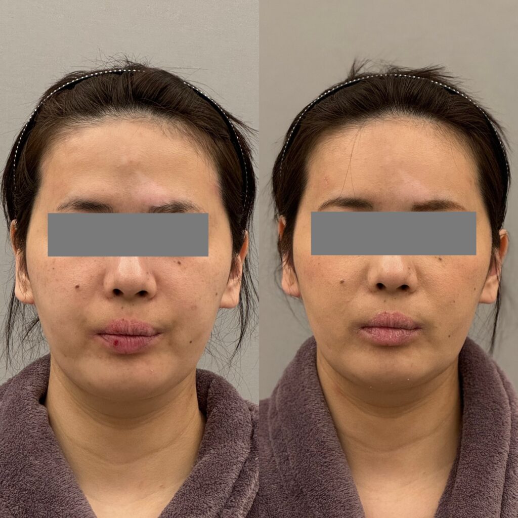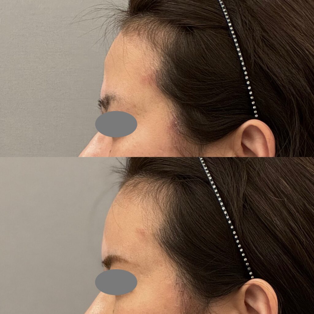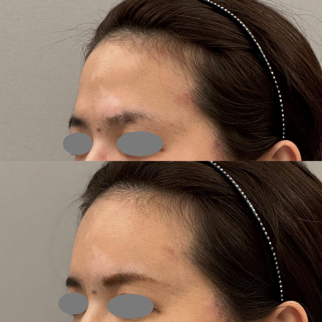 30代女性 おでこの凹みが気になる。脂肪注入による自然な仕上がりでボリュームがつき柔らかな印象になりました。ヒアルロン酸でも可能ですが脂肪は定着すると長期間長持ちするのでおすすめ部位です。完成は3ヶ月程度です。料金:額脂肪注入220,000円、採取・加工料330,000円 別途静脈麻酔代や血液検査代や固定着代がかかります。副作用・リスク:出血、感染、色素沈着、傷跡、脂肪壊死、oil cystが生じる、脂肪の定着には個人差がある、理想とする仕上がりにならない可能性があるなど。