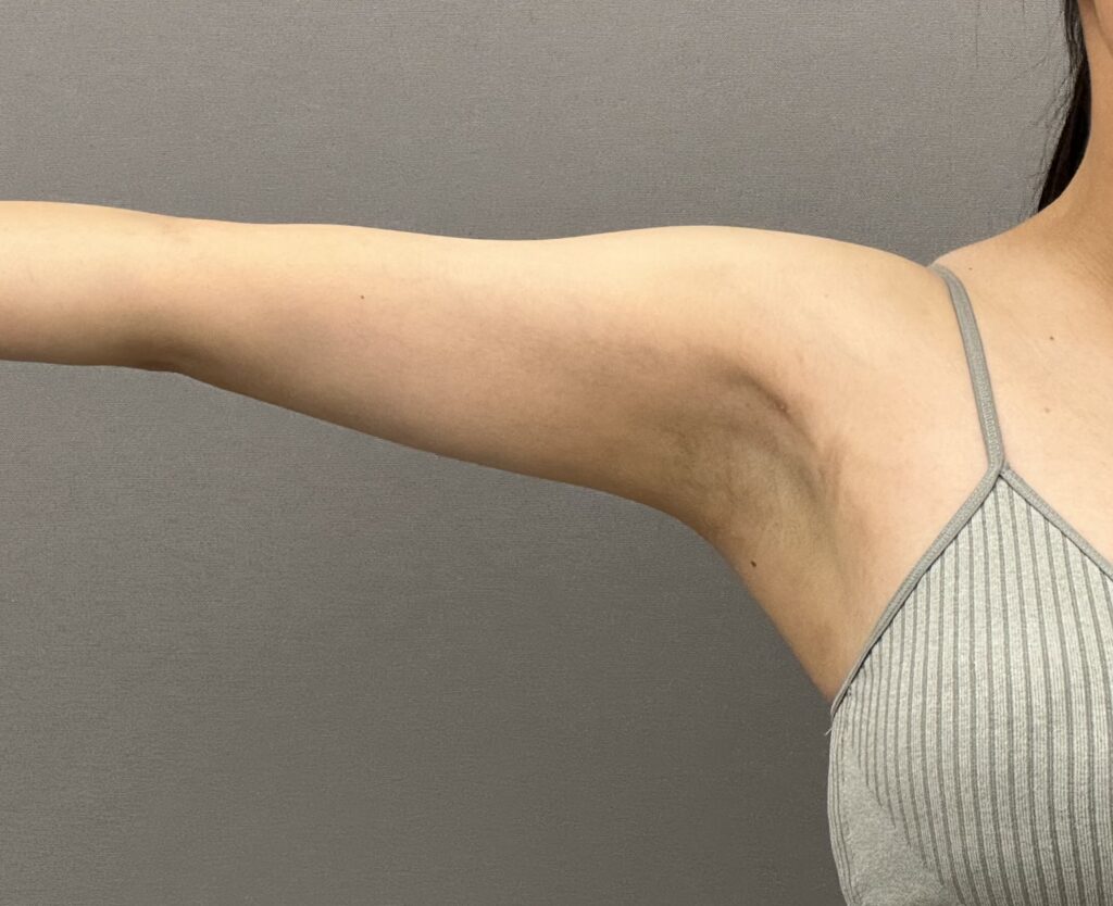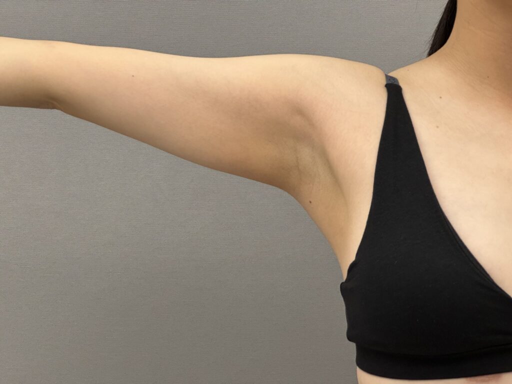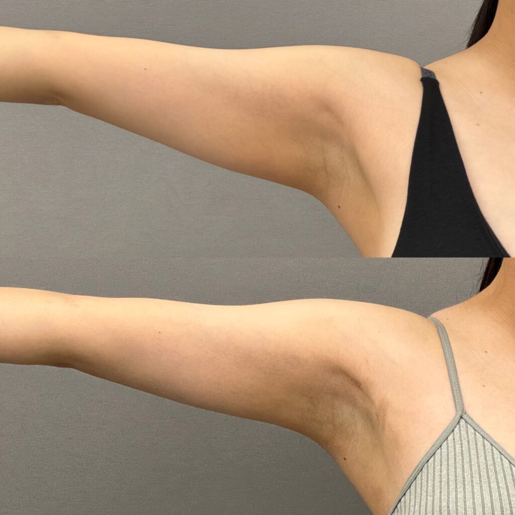 30代女性 165cm 55kg BMI20.2 二の腕の脂肪が気になる。元々細身でしたが、運動しても落ちにくい二の腕の脂肪を吸引することでよりスッキリと細い二の腕になりました。まだ術後2ヶ月なのでここから6ヶ月かけてさらに引き締まり細くなって完成します。料金:VASER脂肪吸引(二の腕・肩)498,000円(税込) 別途静脈麻酔代や血液検査代や固定着代がかかります。副作用・リスク:出血、感染、色素沈着、傷跡、凹凸を生じる可能性、左右差を生じる可能性、理想とする仕上がりと異なるなど。