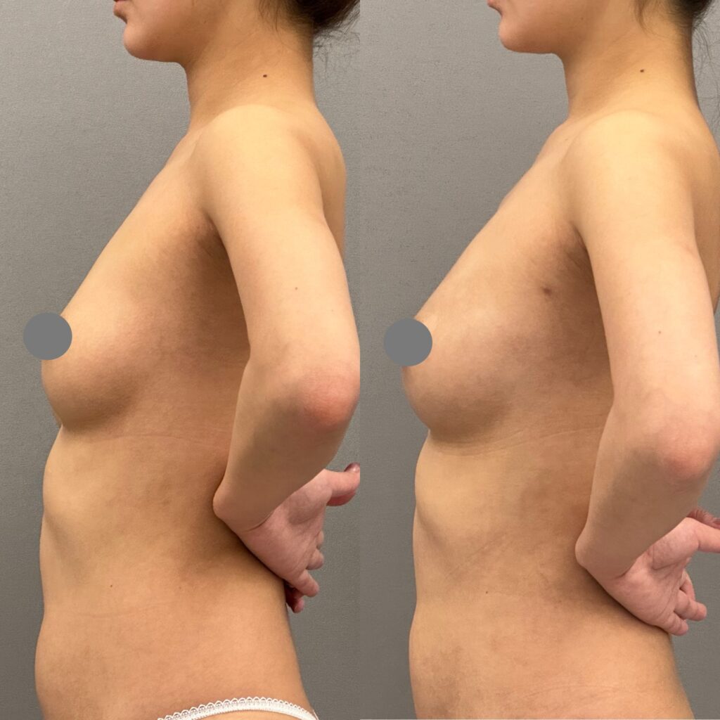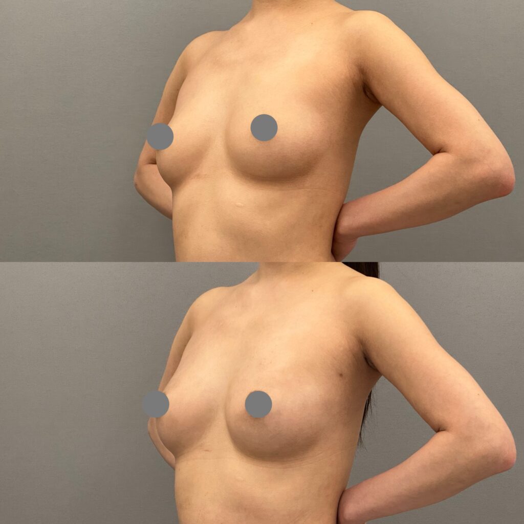 30代女性。授乳経験なし。お腹周りをスッキリさせたい、豊胸もしたいとのことでした。気になっているお腹周り(全腹部と腰)から脂肪採取を行い、脂肪豊胸を行いました。バストアップと同時に上半身がスッキリしてメリハリのあるボディに変化しました。腹部に色素沈着が見えますが、時間と共に改善していきます。仕上がりが楽しみですね。料金:脂肪豊胸(採取4部位)1,320,000円(税込) 別途静脈麻酔代や血液検査代や固定着代がかかります。副作用・リスク:出血、感染、色素沈着、傷跡、脂肪壊死、oil cystが生じる、脂肪の定着には個人差がある、希望とするサイズにならない可能性があるなど。